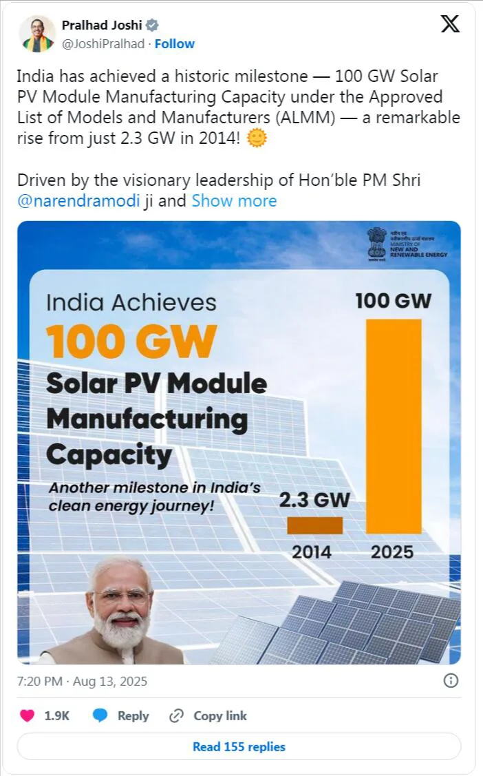 Indian New Renewable Energy Alliancen ministeri Prahad Joshi korosti tätä saavutusta ja totesi: "Intia on saavuttanut historiallisen virstanpylvään - hyväksyttyjen mallien ja valmistajien luettelon (ALMM) mukaan aurinkosähkömoduulien tuotantokapasiteetti on saavuttanut 100 gigawattia, mikä on merkittävä kasvu 2,3 gigawatista ministeritason johtajuudesta! Narendra Modi ja muuntavien aloitteiden, kuten The Efficient Solar Module Production Linked Incentive Scheme (PLI), Intia rakentaa vahvaa ja omavaraista aurinkoenergian valmistusekosysteemiä. Tämä saavutus lisää vauhtia kohti Atmanirbhar Bharatia ja auttaa Intiaa saavuttamaan tavoitteensa saavuttaa 500 gigawatin ei-fossiilisen energian tuotantokapasiteetti vuoteen 2030 mennessä.